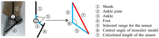 where and denote the initial length and the length in the given situation of the sensor, respectively. As shown in Figure 2c, we assumed movement of the ankle as a cylindrical joint with a radius r. denotes the initial central angle of the ankle, and denotes the angle variation in the ankle joint.