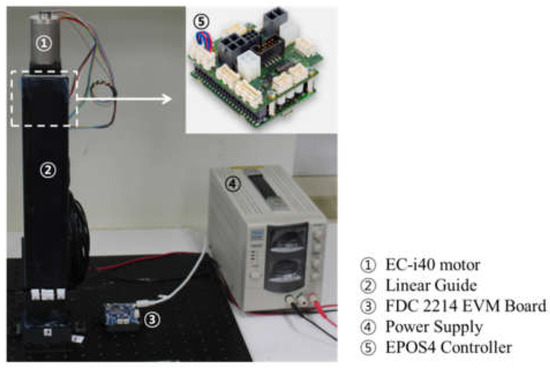 The EC motor was actuated with a sinusoidal profile at a speed of 250 rpm (25 mm/s) with respect to the sensors. The mount for fixing the sensor was printed using a 3D printer (M200, Zortax, Seongnam, Korea). A metal hook was sewed to the mount. Figure 7a shows the linear actuator system. During oscillation, the sensor value was recorded by the evaluation module (FDC 2214 EVM, Texas Instruments, Texas, USA) using the Sensing Solution EVM GUI software. The sampling rate was fixed at 25 Hz. Motor control was programmed using LabView.