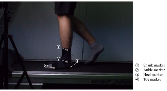 Filmed movies were analyzed in Kinovea, which is widely used in motion tracking research [26,27,28,29]. To synchronize both the sensor signal and the movie, the frame rate of the movie was set to 50 FPS. Low-quality movie files and uneven sensor values were discarded. The subjects wore a marked ankle brace to track the position of each segment. Figure 8 shows a subject walking on a treadmill with a color-marked ankle brace. The marker was attached to the forefoot, heel, ankle, and shank. With the trajectories of these markers, the trajectories of the foot and leg could be calculated. After the angle of each segment was derived, the ankle angle was calculated, as mentioned in [30]. In this study, a positive change denoted dorsiflexion, and a negative change indicated plantar flexion. For gait analysis, we randomly selected three sequential steps from the sensor signal. The same steps were selected for the filmed movie. The selected steps were found in the movie based on the visual effects of the subjects. We then tracked the position of each marker on the ankle brace mentioned above during step sequences. After tracking, we calculated the ankle angle of the selected steps as in [30].