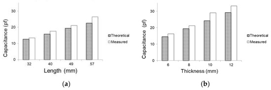 First, we measured the initial value of each sensor and compared it with the theoretical capacitance value. A digital capacitance meter (LCR-6300, GW Instek, Xinbei, Taiwan) was used to measure the capacitance level of the sensors. The results are presented in Figure 9. The maximum error was 16.95%, which occurred for the sensor with dimensions of 57 × 8 mm. In most cases, the error was less than 10%. Both the measured and theoretical initial capacitance levels of each sensor increased linearly with respect to the dimensions. In Figure 9, the theoretical and measured values are compared in two ways: by the length and thickness of the sensors.