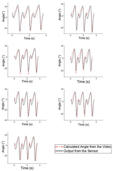 The output from the sensor was converted to a degree unit (°). We measured the value of the sensor at 100% strain. Then, using the output value of each sensor output, we calculated the applied strain for each gait cycle in length units (mm). Finally, using the maximum angle range of each gait, we calculated the ratio between the sensor strain and the ankle angle. The accuracy of the sensor signal is represented as the RMS error between the video and the sensor signal. When the frame rate of the video and the sampling rate of the sensor signal are the same, we can calculate the RMS error.