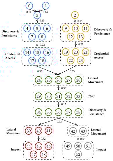 To evaluate IRP, we use a subset of some of the most popular TTPs [] available in the MITRE ATT&CK Enterprise matrix to create the graph of Figure 1. The graph is a small-scale representation of a corporate network with multiple hosts and multiple attack actions (TTPs) available at each host. Each attack action is represented by an edge on the graph, while each decision point, i.e., the point in time when players decide their next move, is represented by a node. As this is a multi-host environment, we use different colours to represent different hosts of the network. In this way, decision points (i.e., nodes) that belong to the same host are outlined with the same colour. Edges connect decision points in a logical way, for instance, for the Attacker to move from any Discovery & Persistence node (Nodes 4–8) of the blue host to any Lateral Movement node of the green host (Nodes 24–28), he/she needs to first acquire the required credentials through any Credential Access node (Nodes 14–18). This is because acquiring valid credentials is a requirement for all the Lateral Movement TTPs used in this case study by the Attacker to move to the next host.