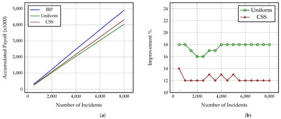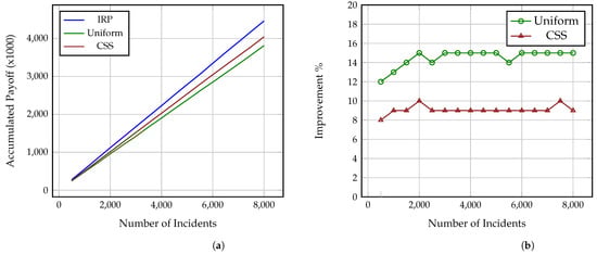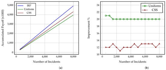Performance comparison of IRP, Uniform and CSS on N = 8000 simulated incidents against CSS Attacker. (a) Accumulated payoff, (b) Percentage of IRP improvement.