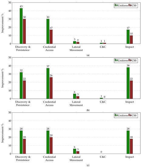 Figure 5a–c present the average improvement of IRP on Uniform and CSS per TTP Tactic across 8000 incidents. This allows us to get a deeper understanding on how the number of available edges at each decision point and the variety of their cost and benefit values affect the performance of each strategy.