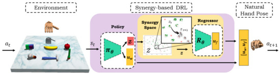The proposed synergy–based DRL for natural object manipulation with a synergy space of object haptic information and a deep regressor to derive natural hand poses of the ADROIT anthropomorphic robotic hand.