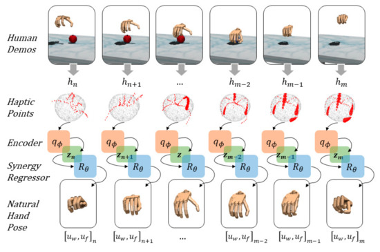 From human demonstrations (top row), haptic information is shown in point clouds (second row). CNF encodes the haptic information, into a synergy space representation, . The deep regressor, estimates natural hand poses (final row) in time series.