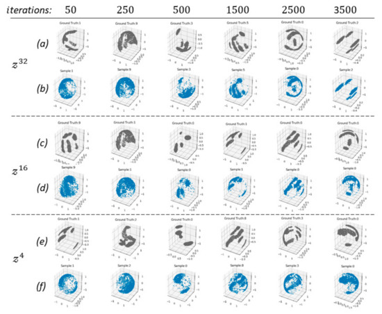 Reconstruction of object haptic information using the synergy-based encoder-decoder via CNF for three synergy dimensions. The illustrations are derived from training iterations: (a), (c), and (e) point clouds shown in gray are the ground truth haptic maps, the (b), (d), and (f) point clouds in blue are the reconstructed maps from CNF models with dimensions of , respectively.