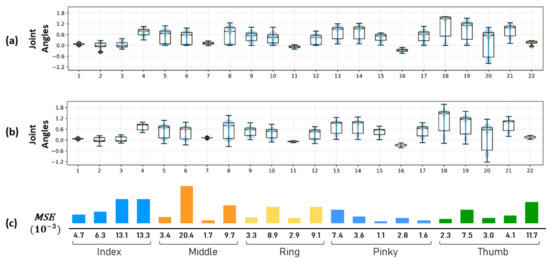 The mean squared error (c) between the joint angle distributions of the haptic map dataset, (a) and the angles distributions estimated by the regressor (b) for each finger in the anthropomorphic hand. A lower error indicates higher confidence in estimating the joint angles of a natural grasping pose.