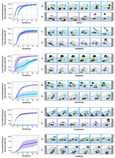 The left column shows the average sum of rewards from training the manipulation task with the proposed synergy-based DRL in purple and synergy-less standard DRL in blue. The solid line represents the mean and the shadow area of the standard deviation of the rewards. The right column shows the time-series frames from grasping and relocation of each object from apple, banana, hammer, lightbulb, flashlight, and camera with the standard DRL in the blue frames of (a,c,e,g,i,k), and the proposed synergy-based DRL in the purple frames of (b,d,f,h,j,l).