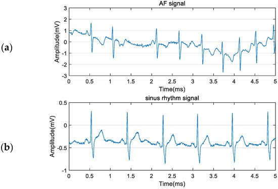 The MIT-BIH Atrial Fibrillation Database (MIT-BIH AFDB) of PhysioNet was exploited in this study [28]. This database contains long-term ECG recordings from 25 subjects. Most of AF is paroxysmal atrial fibrillation (PAF). There are four types of manual rhythm annotations, which are AFIB (atrial fibrillation), AFL (atrial flutter), J (AV junctional rhythm), and N (used to indicate all other rhythms), respectively. We choose to study the AF signals annotated by AFIB rhythms. To maintain the balance of data categories, we only selected normal ECG signals except for AF signals. Fragments of the AF signal and the normal ECG signal are shown in Figure 1. As 00735 records and 03665 records are represented by the rhythm and unchecked beat annotation, only the remaining 23 records were used. Every recording includes two types of ECG signals sampled at 250 Hz with 12-bit resolution over a range of ±10 millivolts for up to 10 h. The recording numbers of specific ECG signals are shown in Table 1.
