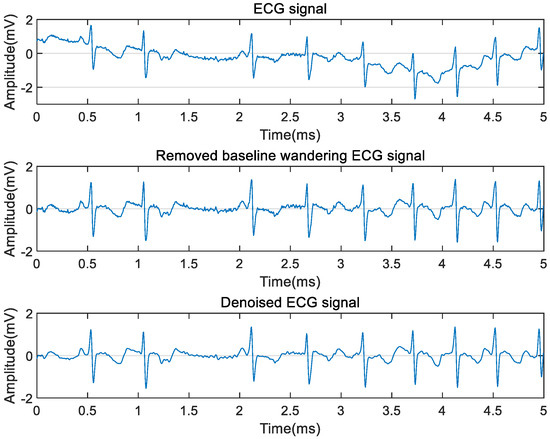 Firstly, baseline wandering and noises were removed from the contaminated ECG signals. The polynomial fitting method was used to remove the baseline drift. In the beginning, the least square method was used to fit the original ECG signals. Then, the trend term was obtained by using the minimum standard of the sum of squares of the difference between the fitting curve and the actual ECG signal. The order of removing the trend term was 13. Lastly, the ECG signal without the baseline drift was obtained by removing the trend term. On this basis, Savitzky-Golay (SG) filter was used to smooth the ECG signal. The appropriate window length and fitting order should be selected. The window length should not be too large and should be odd, and the parameter selection can be seen in [29]. In this study, the window length was 9, and the order was 3. This combined approach decreased the interference of non-stationary noise, reduced the complexity of ECG signal, and highlighted the characteristic information of waveforms. The specific implementation process is shown in Figure 2.