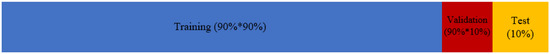 Finally, short-term AF signals and normal ECG signals of different lengths were separated. In the experiment, we segmented the ECG signals with different lengths at 1 s, 2 s, 3 s, 4 s, and 5 s. Most ECG recordings from MIT-BIH AFDB are PAF signals, and the number of normal ECG signals is much larger than that of AF signals. Therefore, the number of the two types of ECG signals was balanced. The ratio of the training set and testing set was 9:1, which was randomly divided according to the stratified sampling method. The probability ratio of the number of AF signals and the number of normal ECG signals was consistent between the training set and the test set. The proportions of the training set and test set at different durations remained the same. The 10-fold cross-validation method was used for model selection and hyperparameters adjustment, and the percentage of ECG segments used for training, validation, and testing was shown in Figure 4. The number of specific ECG fragments is shown in Table 2.