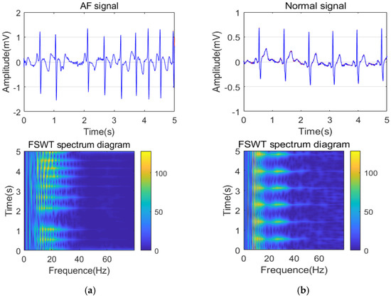 Meanwhile, FSWT was widely used in vibration signal (including beam structure, overvoltage, bearing, explosion, and seismic), biological signal, and noise detection. For instance, Liu et al. [15] located the damage of beam structure using the FSWT method, which improved the accuracy of damage location. Zhang et al. [16] extracted features of overvoltage waveforms using FSWT technology, and then used stacked sparse autoencoders to classify overvoltage effectively. Luo et al. [17] introduced the bounded adaptive frequency slice function as the dynamic frequency filter to improve the FSWT for ECG, PPG, and PCG physiological signals. In summary, the studies indicated that the FSWT could effectively display the time-frequency domain information. Thus, it was applied to the feature extraction for automatic detection of AF.