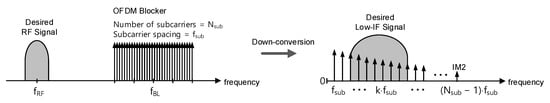 The modern UHF and VHF bands are crowded with a variety of multi-tone signals. They always can be seen as unwanted strong interferers to the MedRadio biomedical devices and sensors. For example, the fifth-generation new radio (5G NR) band encompasses 600–800 MHz UHF band in its frequency range 1 (FR1) band. Additionally, digital broadcasting standards such as the advanced television systems committee (ATSC) of the United States and Korea [], the digital video broadcasting (DVB) of Europe [], and the intelligent service digital broadcasting (ISDB) of Japan [] are serviced in the VHF band of 54–216 MHz and UHF band of 470–860 MHz. Moreover, these interferences are likely to adopt the orthogonal frequency division modulation (OFDM) signaling for high data rate and strong multi-path fading resilience. When an equally spaced multi-tone OFDM signal comes into the MedRadio device as an interferer, numerous intermodulation distortion components will be created by the multiple subcarrier tones, even though they are out of the band. Thus, in modern MedRadio receiver design, it is essential to analyze the effects of the out-of-band (OOB) interference on the receiver’s signal-to-noise ratio (SNR) and to design circuits for mitigating its effects. Note that this issue usually cannot be neglected in typical MedRadio receivers even though the interference exists out of the band. We cannot expect sufficient filtering and attenuation for the OOB interference at the RF front end because typical MedRadio antennas show wideband characteristics [], a complex of high-order matching and filtering at the RF front end may not be favored for low cost and small form factor realization [], and the LNA in a receiver integrated circuit is not typically band-specific because resistive loads are frequently adopted rather than bulky inductors for the small silicon area.