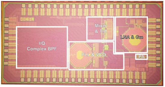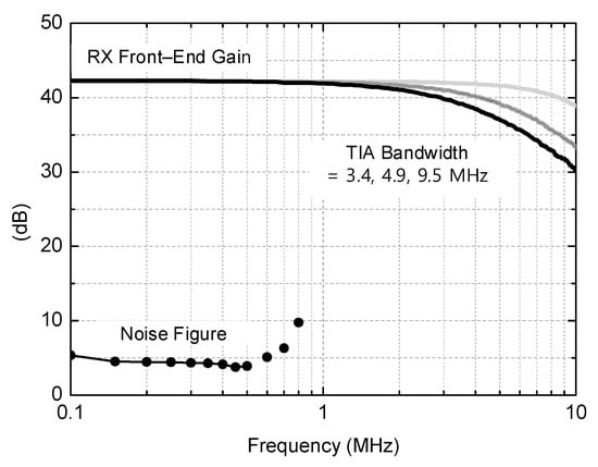 The measured gain and noise figure performances of the RF front end are plotted in Figure 9. The measurements were done by probing intermediate test ports at the TIA output. The gain is measured by applying the RF and LO signals by using signal generators and reading the output power level by using a spectrum analyzer (N9030B of Keysight Technologies Inc., Santa Rosa, CA, USA). The measured passband gain of the RF front end is +42.2 dB. As shown earlier in Figure 5, the on-chip feedback components R1 and C1 of the TIA are tunable. By controlling these, the TIA bandwidth is tuned between 3.4 and 9.5 MHz in eight steps. Among them, Figure 9 only displays three selected curves corresponding to the minimum 3.4 MHz, medium 4.9 MHz, and the maximum 9.5 MHz conditions for the TIA bandwidth.