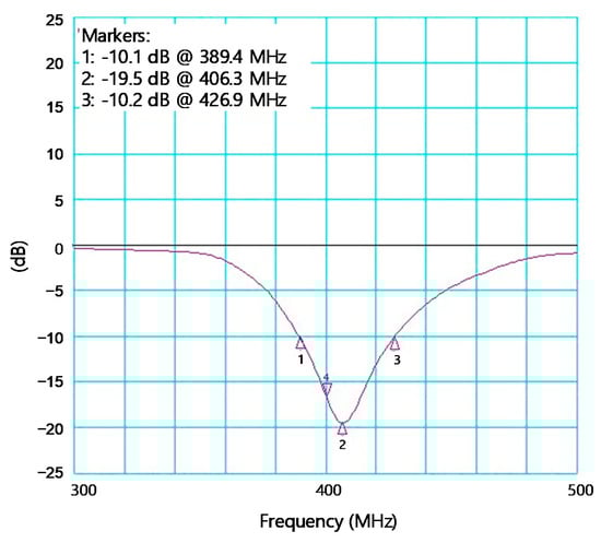 Figure 8 shows the measured S11 of the receiver. The input impedance bandwidth having S11 < −10 dB is 37.5 MHz between 389.4 and 426.9 MHz. It shows that the single series off-chip inductor Lext shown in Figure 5 is enough to achieve the satisfactory input bandwidth for the MedRadio applications. Note that this external Lext is not changed during the subsequent whole OOB blocker measurements.