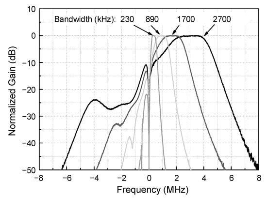 Figure 10 shows the measured frequency responses of the complex BPF. The measured curves exhibit the bandwidth tuning and image rejection performances at a medium gain condition. Although not shown here, the gain is also tunable between −22.5 and +45.4 dB in 24 steps. However, normalized gains are drawn in Figure 10 for the sake of clarity. The bandwidth is tunable between 230 and 2700 kHz in 16 steps by tuning the switched resistor and capacitor components R1, C1, R3, and C3 in Figure 4. Figure 10 only displays the four selected curves out of the total 16 curves. The image rejection ratio can be evaluated by taking the ratio of the two gain values, one at the passband’s center-frequency point and the other at its image-frequency point. The resulting image rejection ratio is 26.4–33.3 dB, which is sufficient enough considering that the minimum required SNR is 14 dB.