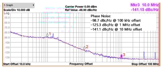 Figure 11 is the measured phase noise of the PLL synthesizer at the output frequency of 400 MHz. The measured phase noise is −98.7 and −125.3 dBc/Hz at 100 kHz and 1 MHz offsets, respectively. The phase noise performance is comparable to the previously reported similar LC VCOs in [,], whereas it is much better than [] for the same MedRadio applications because of the LC cross-coupled structure rather than the ring oscillator structure.