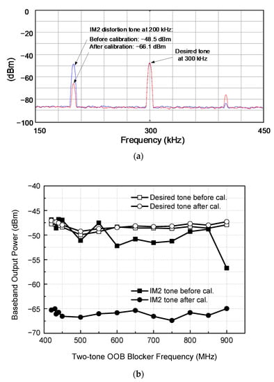 The IM2 calibration is verified through extensive measurements over more than five samples. All results show reasonably good agreements with acceptable variability. Figure 12a shows the measured spectrum, demonstrating how the IM2 distortion is suppressed by the proposed IM2 calibration. The desired RF single tone of −90 dBm at 403.5 MHz are fed to the receiver together with two-tone blocker of −50 dBm at 433.0 and 433.2 MHz. The receiver is set to a nominal gain condition. Then, the wanted IF and unwanted IM2 tones appear at 300 kHz and 200 kHz, respectively. Before the IM2 calibration, the desired and distortion tones are −47.8 and −48.5 dBm, respectively. After the IM2 calibration is carried out, the desired tone power does not show a noticeable change, whereas the IM2 tone power is significantly reduced from −48.5 dBm to −66.1 dBm. As a result, the signal-to-IM2-distortion ratio is improved from +0.7 dB to +18.3 dB. It implies that before the calibration, the receiver cannot satisfy the 14 dB SNR requirement, but after the calibration, it successfully satisfies the SNR requirement with a sufficient margin of 4.3 dB.