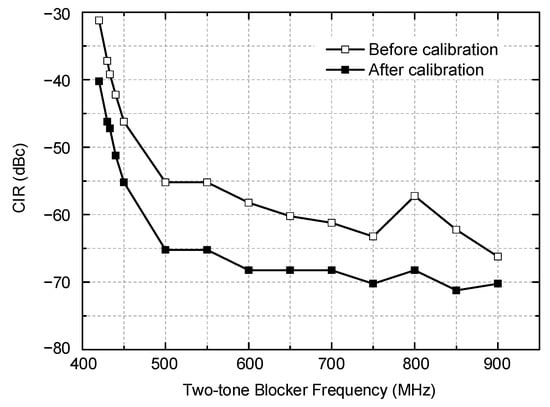 The interference tolerance performances of the receiver against the OOB two-tone blocker are evaluated through the carrier-to-interference ratio (CIR) measurements and plotted in Figure 13. The maximum tolerable CIR is measured as following. First, a −90 dBm desired signal at 403.5 MHz is fed to the receiver, and an OOB two-tone blocker with 200 kHz spacing between 420 and 900 MHz is injected together. Then, the blocker signal power is raised until the output SNR reaches 17 dB. Note that we use a 3 dB higher SNR requirement for this CIR test by considering that any more noise and distortion contributions other than this IM2 distortion can be additionally involved in practice. Then, the ratio of the signal and blocker power at this 17 dB SNR condition is defined as the maximum tolerable CIR. The measured results are plotted in Figure 13. The maximum tolerable CIR indicates the receiver’s selectivity performance against the two-tone blocker. As can be seen in Figure 13, the proposed IM2 calibration effectively improves the CIR by 4–11 dB across the UHF band. The CIR after the calibration is −40.2 dBc at 420 MHz, which is very close to the in-band, and gradually improves up to −71.2 dBc as the blocker frequency moves farther away out of the band. The measured CIR can also be translated to the maximum tolerable two-tone blocker power of −49.8–−18.8 dBm. Then, considering Poffset = 6.56 dB as discussed in Section 2, we can conclude that the equivalent OFDM blocker power of −43.2–−12.2 dBm can be tolerated by this RF receiver.