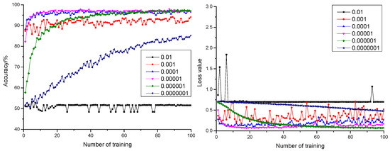 All groups of training precision rate, anticipation rate, training loss value, and anticipation loss values are shown in Table 1. According to the training results in Table 1, learning rate and dropout combination were of a relatively significant influence on accuracy and loss value of training and anticipation. In the training set, the learning rate was set as 0.0001, 0.00001, and 0.000001. The training precision rate was 100% at both 0.3 and 0.5 dropout configurations. When the learning rate was configured as 0.00001 and the dropout as 0.7, the training precision rate was 100%, and the training loss value was basically close to 0.