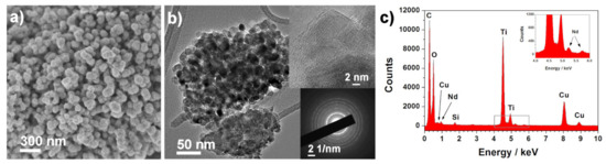 Morphological characterization was carried out for all the synthesized samples, but, for simplification, only the 3 wt.% Nd3+–TiO2 results are shown (Figure 2); SEM and TEM investigation of 3-Nd–TiO2 revealed that the sample consists of round-like structures, with diameters between 150 nm and 300 nm (Figure 2a), which are composed of aggregated nanoparticles with diameters around ~15–20 nm (Figure 2b). The powder sample is polycrystalline, as revealed by the selected electron area diffraction (SEAD) pattern (Figure 2b, bottom inset). The EDX spectrum (Figure 2c), taken over the same area as presented in Figure 2b, shows the presence of neodymium. The measured d-spacing of the lattice (101) planes is 0.37 nm, and is slightly increased when compared to 0.35 nm for anatase (ICDD 78-2486 pattern). The neodymium content, determined with EDXS analysis using SEM, was 0.6 wt.% ± 0.3 (0.5-Nd–TiO2), 0.9 wt.% ± 0.2, (1-Nd–TiO2) and 2.9 wt% ± 0.4 (3-Nd–TiO2).