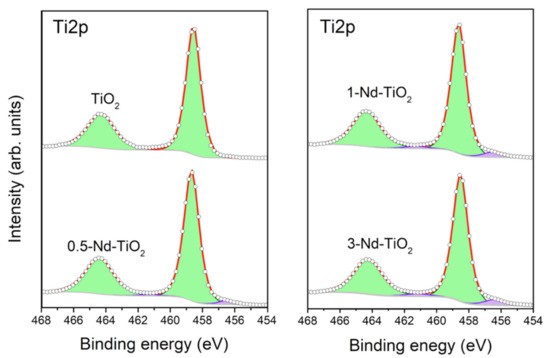 X-ray photoelectron spectroscopy was used to determine the surface chemical composition of the nanoparticles, and the oxidation state of the titanium in the samples. The survey spectra of the samples show the presence of titanium, oxygen, carbon, and neodymium (Supplementary Materials Figure S1). The presence of carbon is related to contamination due to air exposure. The curve-fitting analysis of the high-resolution Ti2p spectra of undoped, 0.5, 1 and 3 wt.% Nd–TiO2, shown in Figure 3, provides information on the chemical states of the titanium in the samples. Because of the j–j coupling or spin–orbit splitting of the Ti2p level, each state of oxidation of titanium has two components in the spectrum, named as the doublet, one corresponding to Ti2p3/2 and another to Ti2p1/2. To reproduce the Ti2p spectra of the three Nd–TiO2 samples, two doublets were used. The doublet with binding energies at 458.5 and 464.2 eV (green doublet) is assigned to the titanium with an oxidation state Ti4+ [45]. The doublet with binding energies at 456.3 and 461.1 eV (purple doublet) was reported to be associated with Ti3+. The relative contribution of this component to the Ti2p spectrum increases for increasing Nd3+ content, from 3.1% of the total amount of titanium in the 0.5-Nd–TiO2 sample, followed by 5.2% in the sample 1-Nd–TiO2, to a relative concentration of 6.0% in the sample 3-Nd–TiO2. It has been reported that even in TiO2 with high crystallinity, a minor amount of Ti3+, due to oxygen vacancies, is present [46,47,48]. Therefore, in the samples, the presence of reduced Ti3+ can be associated with oxygen defects, which increase with an increasing amount of Nd3+, indicating the introduction of oxygen defects in the TiO2 lattice when Nd3+ is added as the dopant, which is in agreement with the XRD results, and as reported in [49]. As expected, metallic titanium (Ti0) was not founded in the samples.
