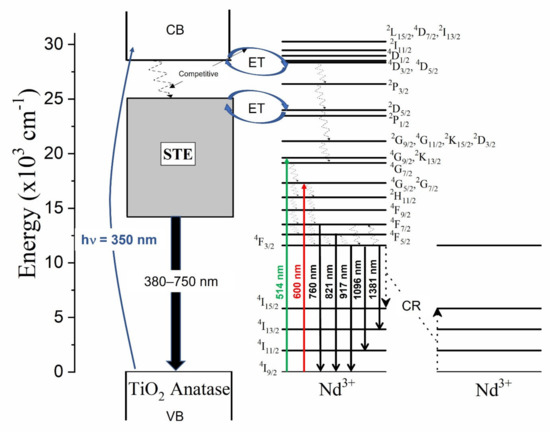 The luminescence properties of the undoped and the Nd3+–TiO2 nanoparticles were investigated, Figure 4 shows the schema of the excitation, radiative emission, energy transfer, non-radiative emission, and cross-relaxation (CR) processes affecting the photoluminescence of this nanomaterial. These processes are described as follows: excitation at 350 nm (~3.5 eV), above the energy band gap of TiO2 (~3.2 eV), promotes the transition of electrons from the valence band (VB) to the conduction band (CB) in TiO2. Then follows energy transfer (ET) from CB to the excited states of the Nd3+ ions, due to resonance in the energy levels. In parallel, non-radiative relaxation occurs, from CB to defect bands within the band gap of TiO2. Both the mechanisms are competitive, with a strong dependence on temperature [14]. Radiative relaxation from the defect bands to the valence band may occur, generating a broad emission band from 380 to 750 nm (see Figure S2). As can be observed, the emission that is associated with the defects has two components for all the samples, with a maximum intensity at 512 nm for the 0.5-Nd–TiO2 sample, while for the 1-Nd–TiO2 and 3-Nd–TiO2 samples, there is a spectral shift in the maxima to higher energy centered at 430 nm; these results are in agreement with the literature [52,53]. The intensity of the defect emission band increases for increasing Nd3+ concentration. As shown by XRD (Figure 1) and XPS (Figure 3), the doping with Nd3+ creates oxygen vacancies in TiO2, which is, therefore, in agreement with the literature, and the long-wavelength defect band emission can be attributed self-trapped excitons (STE) associated with oxygen vacancies [11,14,51,53]. The STE emission intensity of TiO2 increases severally with the increase in Nd3+ concentration, due to the increasing number of oxygen vacancies, and also the increasing concentration of Ti3+ in the nanoparticles, which is in agreement with the XPS analysis of the Ti2p core level.