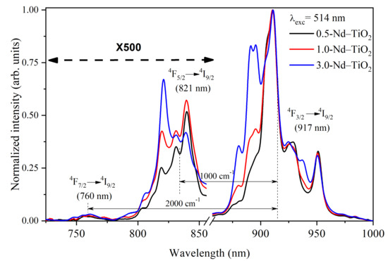 The near-infrared photoluminescence spectra of the x-Nd–TiO2 nanoparticles, obtained using a 514 nm wavelength of excitation, and collected in the range from 725 to 1000 nm using the photomultiplier R632, are presented in Figure 5. For all the samples, three different emissions were observed, centered at 760, 821 and 917 nm, and these emissions are related to the intra-4f transitions of 4F7/2→4I9/2, 4F5/2→4I9/2 and 4F3/2→4I9/2 of Nd3+ ions, respectively. All these spectra were normalized at 911 nm for better visualization.