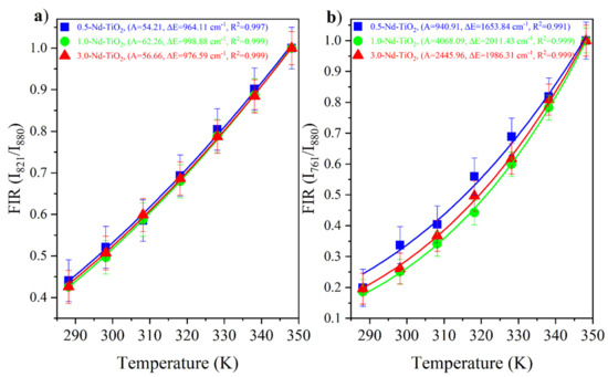 The Nd3+:4F3/2, 5/2, 7/2 are thermally coupled levels, the ratio between the and were obtained from the experimental data and fitted with Equation (1). The and FIR of the x-Nd–TiO2 (x = 0.5, 1.0 and 3.0 wt.%) nanoparticles are showed in Figure 7a and Figure 7b, respectively. The fitted values of A, , and R2 values are also shown in the same figures.