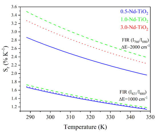 As can be observed, the relative thermal sensitivity decreases as the temperature increases; this phenomenon was observed for all the samples, as was expected from Equation (2) for thermally coupled levels. For the 0.5-Nd–TiO2 sample, the relative sensitivity shows the maximum value of 1.64 %K−1 at 288 K and the minimum value of 1.16 %K−1 at 348 K, when the I821/I880 FIR was used. On the other hand, a maximum value of 2.67 %K−1 at 288 K and a minimum of 2.07 %K−1 at 348 K were calculated when the I760/I880 FIR was used. For the case of the 1-Nd–TiO2 sample, the relative sensitivity shows the maximum value of 1.73 %K−1 at 288 K and a minimum value of 1.19 %K−1 at 348 K, when the I821/I880 FIR was used. Conversely, a maximum value of 3.43 %K−1 at 288 K and a minimum of 2.38 %K−1 at 348 K were calculated when the I760/I880 FIR was used. Alternatively, the relative sensitivity of the 3.0-Nd–TiO2 shows a maximum value of 1.67 %K−1 at 288 K and a minimum value of 1.17 %K−1 at 348 K for the I821/I880 FIR. Secondly, a maximum value of 3.04 %K−1 at 288 K and a minimum of 2.32 %K−1 at 348 K were calculated for the I760/I880 FIR. The 3.0-Nd–TiO2 sample had the higher intensity and the best signal-to-noise ratio; however, the Sr values were lower, which may be associated with the cross-relaxation process, which is more effective at high Nd3+ concentrations, as was shown in Figure S3. The 1.0-Nd–TiO2 sample presented the best Sr values. However, the 0.5-Nd–TiO2 sample did not follow the expected sequence of this set of samples, which could be associated with the low R2 values as shown in Figure 7.