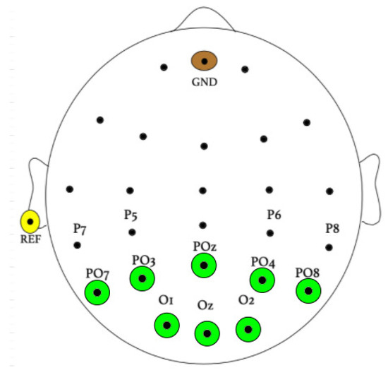 The sampling frequency of EEG signal recordings was found to be 256 Hz. Eight Ag/AgCl electrodes covered the occipital area using a BioSemi ActiveTwo EEG system (Biosemi, Inc. Amsterdam, The Netherlands), as shown in Figure 3, corresponding to electrodes O1, O2, Oz, PO7, PO3, POz, PO4, and PO8.
