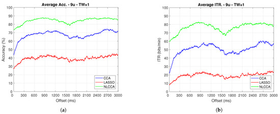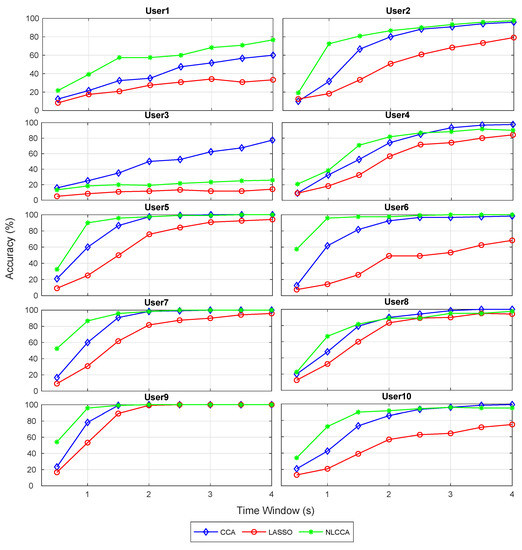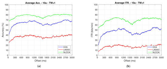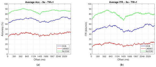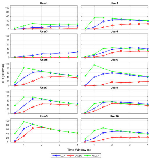 Table 1 illustrates the maximum ITR value per user, and the corresponding recognition accuracy and time window. The last two rows show the average of all the results (excluding user 3). In general, Table 1 reflects a better performance for the NLCCA approach against the others, where NLCCA obtained the highest ITR values for 8 of the 9 users (1, 2, 4–7, 9, and 10)—user 8 being the exception with only 1.1 (bit/min) below the CCA. In addition, the time taken to obtain these highest ITR values was shorter than with the other approaches, with an average of s for NLCCA. In contrast, the time taken to obtain the highest ITR values for the CCA and LASSO corresponded to and s, exceeding the NLCCA by more than one second. The LASSO method obtained the lowest performance in all cases.