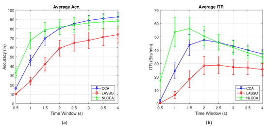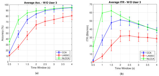 Figure 7a,b present the average accuracy and ITR for 10 subjects, while Figure 8a,b exclude user 3. These last two graphs show that the NLCCA method performs better than the other two, especially within the first 2 s; further, later, it converges with the CCA method. Based on these results, a good performance was evidenced to have been obtained with smaller time windows using NLCCA. In addition, Figure 8a,b show that in the second time window, the NLCCA approach achieves a recognition accuracy of , which is considerably higher than the and of CCA and LASSO, respectively. Here, one second is determined to be sufficient for producing a suitable performance, since the difference between the ITR results for one second and one and a half seconds are undistinguished, as checked by their variances. Besides, a short time window to reduce the fatigue is part of the objective, so one second as a reference value was chosen.