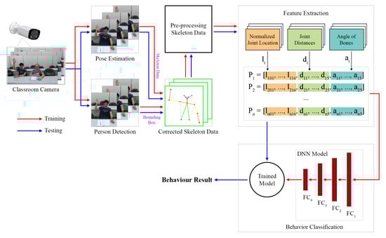 Two main processes were involved in collecting the skeleton data: pose estimation and person detection. The collected skeleton data were corrected using a scheme proposed in this paper, which is an error correction scheme that combines the pose estimation and person detection schemes. The proposed scheme reduces the incorrect connections in the skeleton data. The preprocessed skeleton data were used to remove several joints that had weak effects on behavior classification. Next, feature extraction was performed to generate feature vectors that represent human postures. The features used included normalized joint locations, joint distances, and bone angles. These three feature vectors were concatenated to create a final feature vector, which was used for the training and testing processes related to the proposed system. Finally, behavior classification was conducted to recognize student behaviors. A deep neural network (DNN) was developed for training the classification model. This trained model was used for testing the proposed system. This system can also identify the number of students in a classroom.