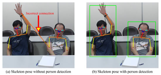 Figure 4 illustrates the combination of pose estimation and person detection. Figure 4a illustrates the use of the pose estimation scheme for collecting skeleton data. An incorrect connection exists in the skeleton data. Figure 4b represents how the pose estimation scheme is combined with the person detection scheme to collect skeleton data. The error correction scheme is used to eliminate the incorrect connection.