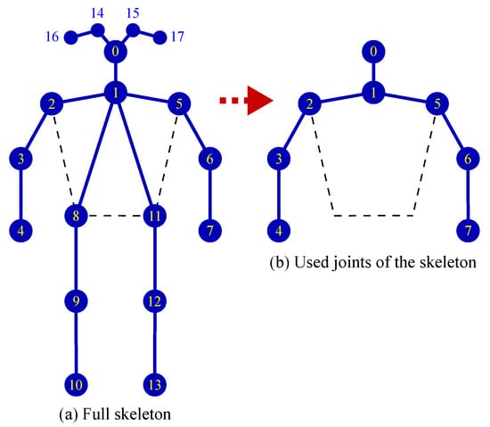 Human pose detection is an attractive research topic in computer vision. The result of human pose detection is the skeleton data, which include detailed joint locations. Two types of skeleton data are available: 3D and 2D skeleton data. Qiang et al. [] proposed a novel approach for human pose estimation using image sensor data. This method combines convolutional pose machines (CPMs) with GoogLeNet. The first stage of the CPMs directly generates a response map of each human skeleton’s key points from the images. Cao et al. [] presented a real-time approach (OpenPose) to detect the 2D pose of multiple people in an image. This method uses a nonparametric representation, called Part Affinity Fields (PAFs), to learn to associate body parts with individuals in the image. Jin et al. [] proposed a novel differentiable hierarchical graph grouping method to estimate multiperson poses. This method could learn the graph grouping in a bottom-up multiperson pose estimation task. They investigated a new perspective of the human part grouping problem as a graph clustering task. Dai et al. [] presented a novel relation-based skeleton graph network (RSGNet) for multiperson pose estimation in crowded scenes. They introduced a skeleton graph machine to enforce the constraint of the human body structure during the joints’ inference for accurate pose estimation.