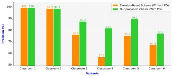Figure 11 presents the precision values of the two compared schemes. The proposed scheme outperformed the skeleton-based scheme. In the first two scenarios (Classrooms 1 and 2), both schemes achieved consistently high precision because these scenarios represent simple situations. Classrooms 1 and 2 comprised only one or two people per image frame, and the camera was located in front of the people in these classrooms. The remaining four classroom scenarios (Classrooms 3–6) represent complex situations. Classrooms 3–6 were crowded, and the camera was placed in the corner in these classrooms. People occupied different areas in the same image frame due to their different distances from the camera. In Classroom 4, the skeleton-based scheme had the lowest precision value of only 57.6%. Due to most students in this classroom being at the end of the classroom that is far from the camera, people’s sizes looked small. Besides, the camera was placed in the corner in this classroom. Therefore, the human pose estimation had numerous incorrect connections. By contrast, the proposed scheme for Classroom 5 achieved the highest precision value of 90.2% among Classrooms 3–6. We observed that the camera view in this classroom had zoomed in, and students were near the camera. Furthermore, students sat separately and did not overlap each other. In Classrooms 3–6, the proposed scheme exhibited superior performance to the skeleton-based scheme. The proposed scheme had a 15.15% higher average precision than the skeleton-based scheme did.