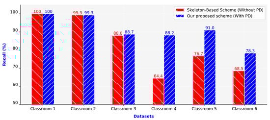 Figure 12 presents the recall values of the two compared schemes. Similar to the precision values, the recall values of the proposed scheme were also higher than those of the skeleton-based scheme. The recall values of the two schemes were almost equal in Classrooms 1 and 2 (100% and 99.3%, respectively). For the remaining four classrooms (Classrooms 3–6), the two schemes had considerably different recall values. The recall of the proposed scheme was higher than that of the skeleton-based scheme. The average recall of the proposed scheme was 12.15% higher than that of the skeleton-based scheme.