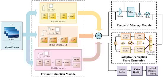 With the recent popularity of smart devices, video-based application services have become popular, resulting in an increase in the demand for high-quality video. Therefore, the accurate perception of video quality is of essential importance for video sharing and streaming platforms. As the foundation of inpainting and enhancement of low-quality videos, video quality assessment (VQA) methods have become a promising research field in the past few decades. Quality evaluation methods contain two categories: subjective ones and objective ones. In general, subjective video quality evaluation by human experts is considered to be the most accurate method []. The scores obtained from subjective methods are often taken as the ground truth of objective evaluation during the training process []. However, this approach is quite time-consuming and expensive, which renders it impractical to test a large number of videos transmitted in real-time. By contrast, objective quality assessment by a computer is cheap and efficient. Objective VQA methods can mimic the human visual system (HVS), distinguish distortion in the video, and thus reasonably perceive the quality of the video. Depending on the availability of reference videos, VQA methods contain three categories: full reference (FR) [,,,], reduced-reference (RR) [,], and no-reference (NR) [,]. Since videos without distortions can be used as the evaluation criterion, in most cases the video scoring results of the FR/RR methods can achieve satisfactory similarity to the results of human perception. When evaluating the quality of videos captured in real-time, however, it is difficult to obtain distortion-free videos as references. Thus the importance of NR-VQA methods can never be overemphasized.