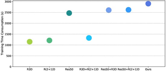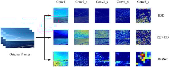 The purpose of multi-dimensional fusion is to obtain rich features that are subsequently propagated to the network for characterizing spatio-temporal information by using different convolutional kernels/different network structures when processing original video clips. The feature maps generated by convolutional networks with different dimensions are shown in Figure 2. We used ResNet networks [], R(2+1)D networks, and R3D networks [], which have similar structures. In addition to 2D-CNN, we select two different multi-dimensional features because, on the one hand, their temporal and spatial meanings are different; on the other hand, it is necessary to prevent spatiotemporal information imbalance.