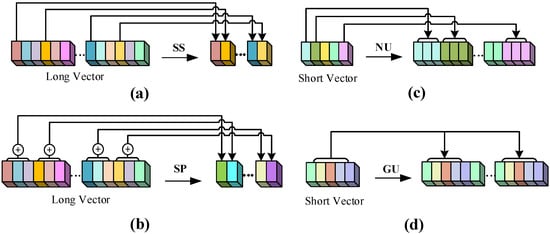 Feature vector size alignment. (a) Long vector sub-sampling (SS). (b) Long vector sumpooling (SP). (c) Short vector nearest-neighbors upsampling (NU). (d) Short vector global upsampling (GU).