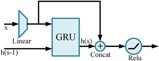 In the above subsection, we use 3D-CNN to model the connection between adjacent frames. The feature f can be considered as an encoding of low-level motion characteristics. In order to further develop a long-time series modeling for high-level features, we use recurrent neural networks (RNN). GRU [] is one of the typical recurrent neural networks that use a gating mechanism to control input, memory, and other information to make predictions based on the current time step. It has the advantage of preserving information in long-term sequences and will not remove it even if it is not correlated with the prediction results. In the network, we implement a multi-level cascade of fully connected layers and recurrent networks. On top of GRU, we add a short path to enhance the learning ability of the network, the structure of which is depicted in Figure 4. This temporal memory block (TMB) is composed of a GRU branch and a shortcut branch, representing historical quality memory and current quality perception, respectively, and thus avoiding an excessive loss of information. Specifically, we concatenate the GRU hidden state at the current moment s with the input information x after dimension reduction and finally feed the result into the nonlinear activation layer.