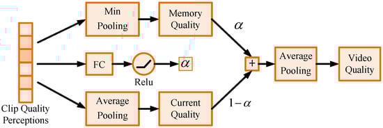 By processing all clips in the video, we generate an array of scores associated with the historical quality impact. In this subsection, we introduce a parameter-adaptive video score generation strategy. Research has shown that a decrease in video quality compared to an enhancement results in the scorer being more impressed. This phenomenon is referred to as the temporal hysteresis effect []. It can be inferred that when there are poor quality clips in the video sequence, the rating perception will drop significantly, while it is not so sensitive to rising quality. Based on this, we try to generate video quality scores Q using clip scores (see Figure 5). As mentioned in [], the final evaluation score consists of two components: memory of the historical worst perceptions and the current rating status .