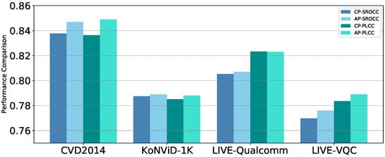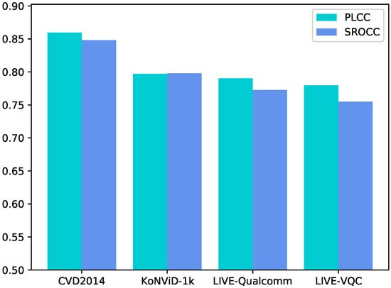 In order to evaluate the effectiveness of the proposed model, we first analyze the general performance of our model with five prominent NR-VQA models (BRISQUE [], VIIDEO [], VBLIINDS [], TLVQM [], and MDTVSFA []) on CVD2014, KoNViD-1k, and LIVE-Qualcomm. All the models are trained with mixed databases, and the indices are calculated by weighted average, with the weight generated by the database size. As shown in Table 4, our approach (the seventh column) demonstrated the best overall performance on three benchmark databases, especially in SROCC metrics, i.e., the proposed multi-dimensional network presents a favorable prediction of monotonicity in NR-VQA.