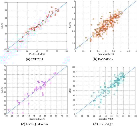 In addition, Figure 7 presents the scatter plots of the subjective MOSs in four datasets versus the predicted scores of the proposed method. We used the trained model to perform score prediction on the test sets of the four datasets. It can be observed from Figure 7 that, for each test set, the predicted scores and ground-truths are evenly distributed on a diagonal line from the bottom left to the top right, showing a good linear relationship.