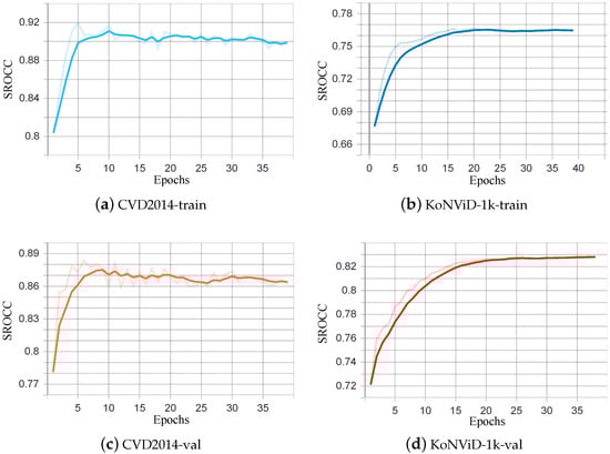 In order to better visualize the training phase, we report the decrease in loss when the number of iterations increases in Figure 8 and the change of SROCC with the increase in epochs on each dataset in Figure 9.