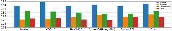 In order to verify the effectiveness of our content-aware part, we further used different spatial feature extractors to replace the 2D feature extractor in this paper. We used four data sets for joint training and evaluated the content perception ability of each network by comparing the average SROCC. In particular, we tested the difference in the performance of the Resnet50 model before and after fine-tuning. The result is shown in Figure 10. Our 2D feature extractor performs the best overall. VGG-16 and ResNet152 achieved the best results on CVD2014 and LIVE-VQC, respectively, but performed poorly on the other three datasets. Our model performed the second-best on CVD2014 and LIVE-VQC but obtained the highest mean value on the remaining two datasets. Moreover, the results on all datasets show that our ResNet50 is more suitable for quality perception than the one without fine-tuning.