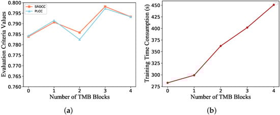 Finally, the computational complexity of quality-aware algorithms is tested by comparing the time consumption of evaluating videos. All tests were run on a computer with Xeon Gold 5220R CPU, 2x Quadro RTX6000 GPU, and the operating system is Ubuntu 18.04. We first considered the effect of different video resolutions on the evaluation time. The computation time consumed on videos with 300 frames from 480p to 4K can be observed in Figure 15a. For comparison with other metrics, a sample video with a resolution of 640 × 480 and 364 frames was chosen from the CVD2014 dataset for the test. As the results in Figure 15b are observed, the proposed method has the best performance without excessive increase in computational complexity. It is worth mentioning that feature extraction and fusion results in an increase in computation time. The timing module and dynamic parameters, however, have almost no influence on the overall evaluation time because it takes only about 0.02 s in the features processing network.