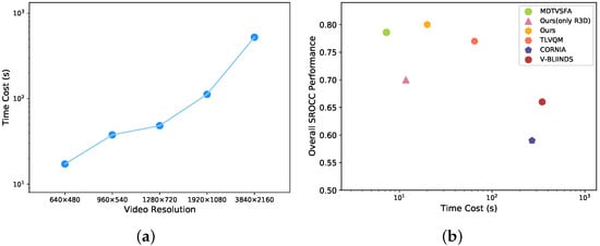 Runtime comparison. (a) Time costs in evaluating videos with different resolutions. (b) Time costs and overall performance comparison with different metrics.